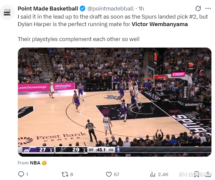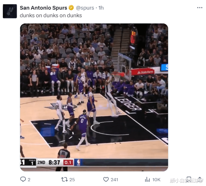 文班亚马还与哈珀配合出了一个势大力沉的空接双手重扣,这一球让马刺主场的球迷们都沸腾了,哈珀这位身高1.96米的高大控卫真的太出彩了。